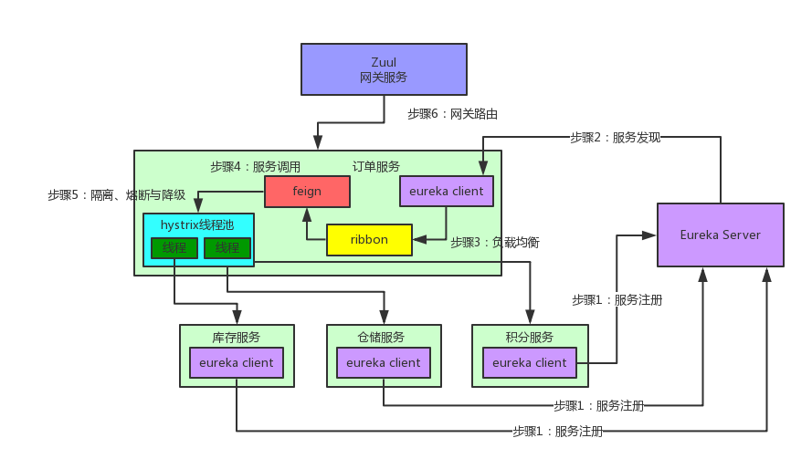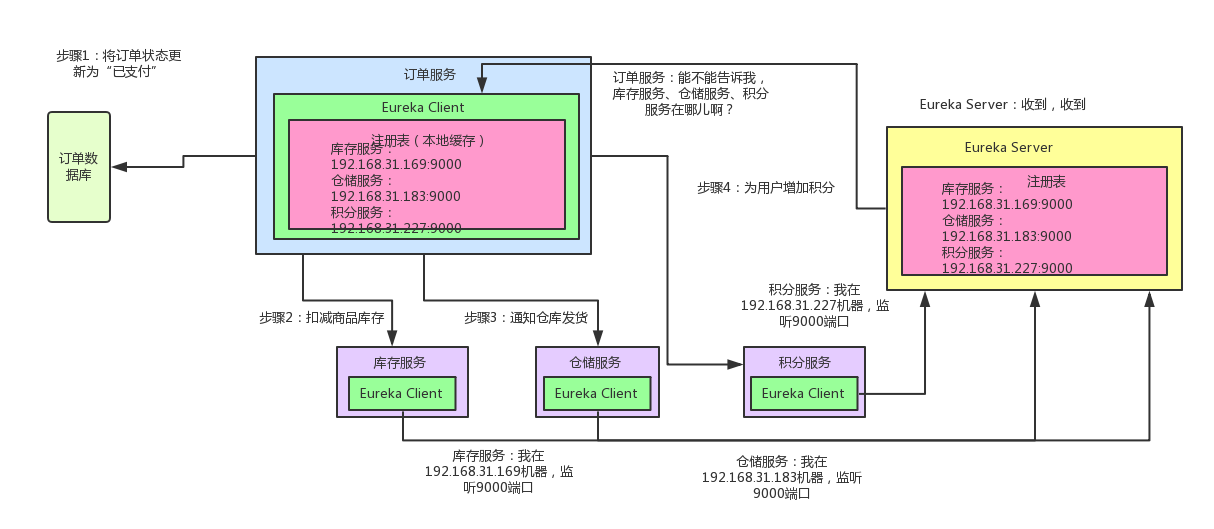 订单服务里也有一个Eureka Client组件,这个Eureka Client组件会找Eureka Server问一下:库存服务在哪台机器啊?监听着哪个端口啊?仓储服务呢?积分服务呢?然后就可以把这些相关信息从Eureka Server的注册表中拉取到自己本地缓存起来。