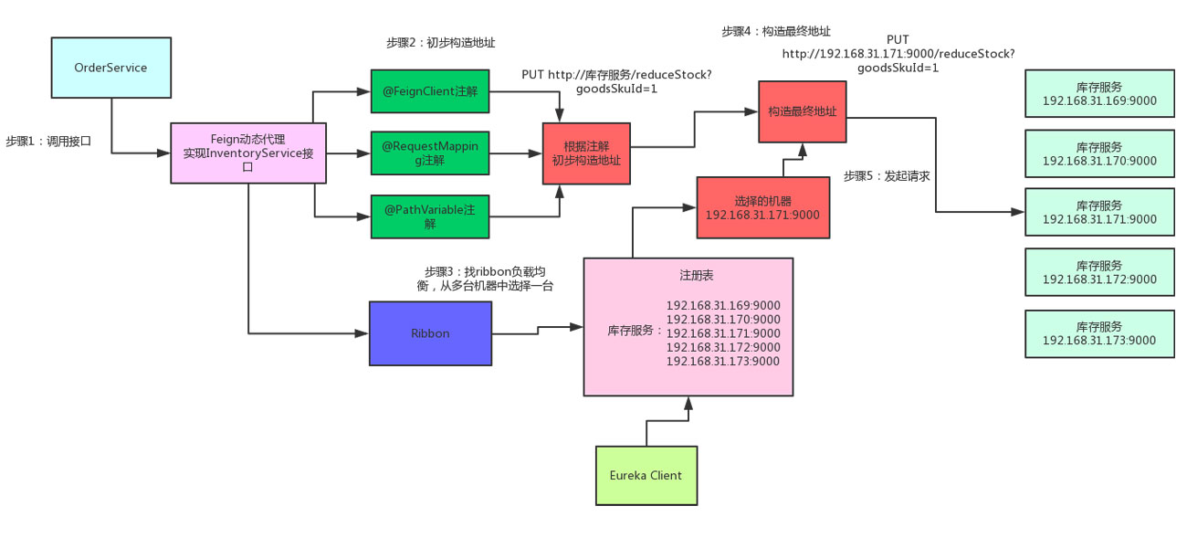 说完了Feign,还没完。现在新的问题又来了,如果人家库存服务部署在了5台机器上,如下所示: