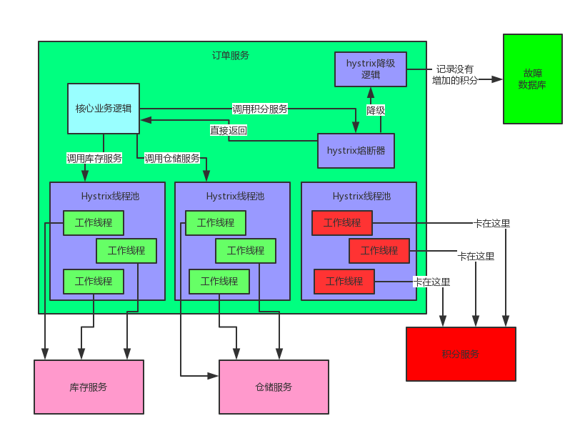当然会导致订单服务里的那个用来调用积分服务的线程都卡死不能工作了啊!但是由于订单服务调用库存服务、仓储服务的这两个线程池都是正常工作的,所以这两个服务不会受到任何影响。